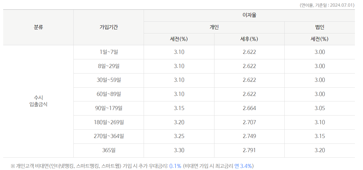 | 추가 우대금리 | 개인고객 비대면 가입 시 연 0.1% (최고금리 연 3.40%) |