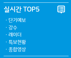 실시간으로 기상청에서 검색하는 정보를 확인할 수 있습니다. 현재 장마 기간으로 단기예보와 강수, 종합 영상 등이 실시간으로 검색이 되고 있습니다.