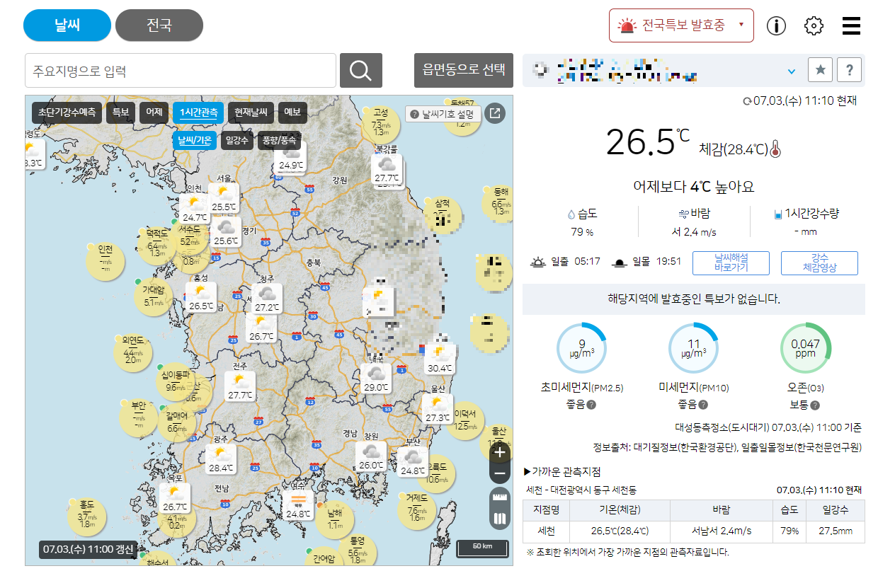 실시간 장마 정보는 기상청 날씨누리에서 확인하실 수 있습니다. 날씨누리에서는 위와 같이 주요지명으로 검색하면 해당 지역의 날씨를 바로 확인할 수 있습니다.