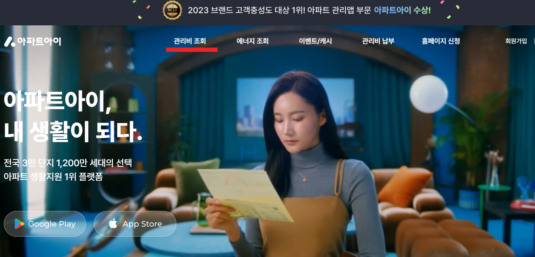아파트아이 앱 다운로드는 위에서 확인하실 수 있습니다. 홈페이지에서 관리비조회를 클릭합니다.