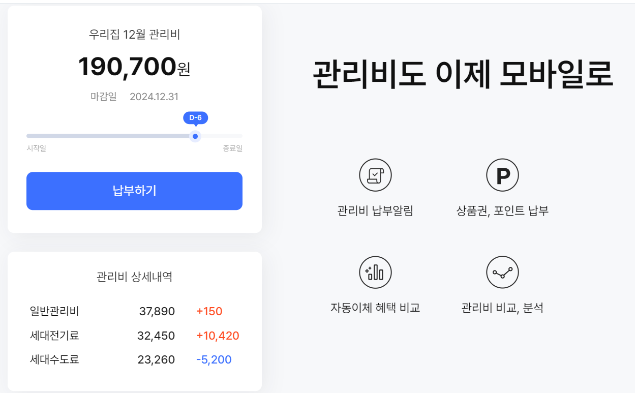 - 관리비 납부 : 카드, 은행 자동이체로 편리하게 납부