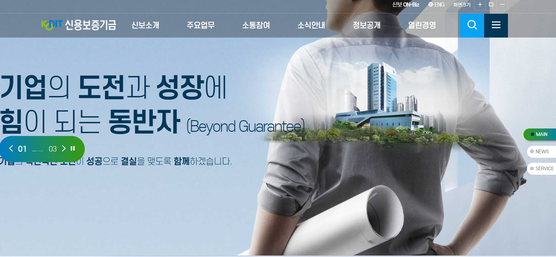 신용보증기금에서는 기업의 미래 성장동력 확충과 국민경제 균형발전에 기여하며 기업의 도전과 성장에 힘이되는 동반자가 되고자 합니다. 신용보증을 이용하게 함으로서 담보문제를 해결하고, 비용절감, 대외신용도 제고 및 기업경영 부담을 완화할 수 있도록 도와주는 기관입니다.